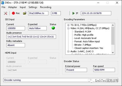DTA-2180能够被Windows应用程序DtEnc软件控制,该软件license出厂默认内置在硬件中,可免费使用。DtEnc可视化的界面允许用户选择可用的编码选项和参数,并监视编码器状态。其编码后的传输流(TS)可以通过PC端的网络端口实现IP输出,亦可以作为一个码流文件存储在PC中,或者被另一个应用程序处理。
