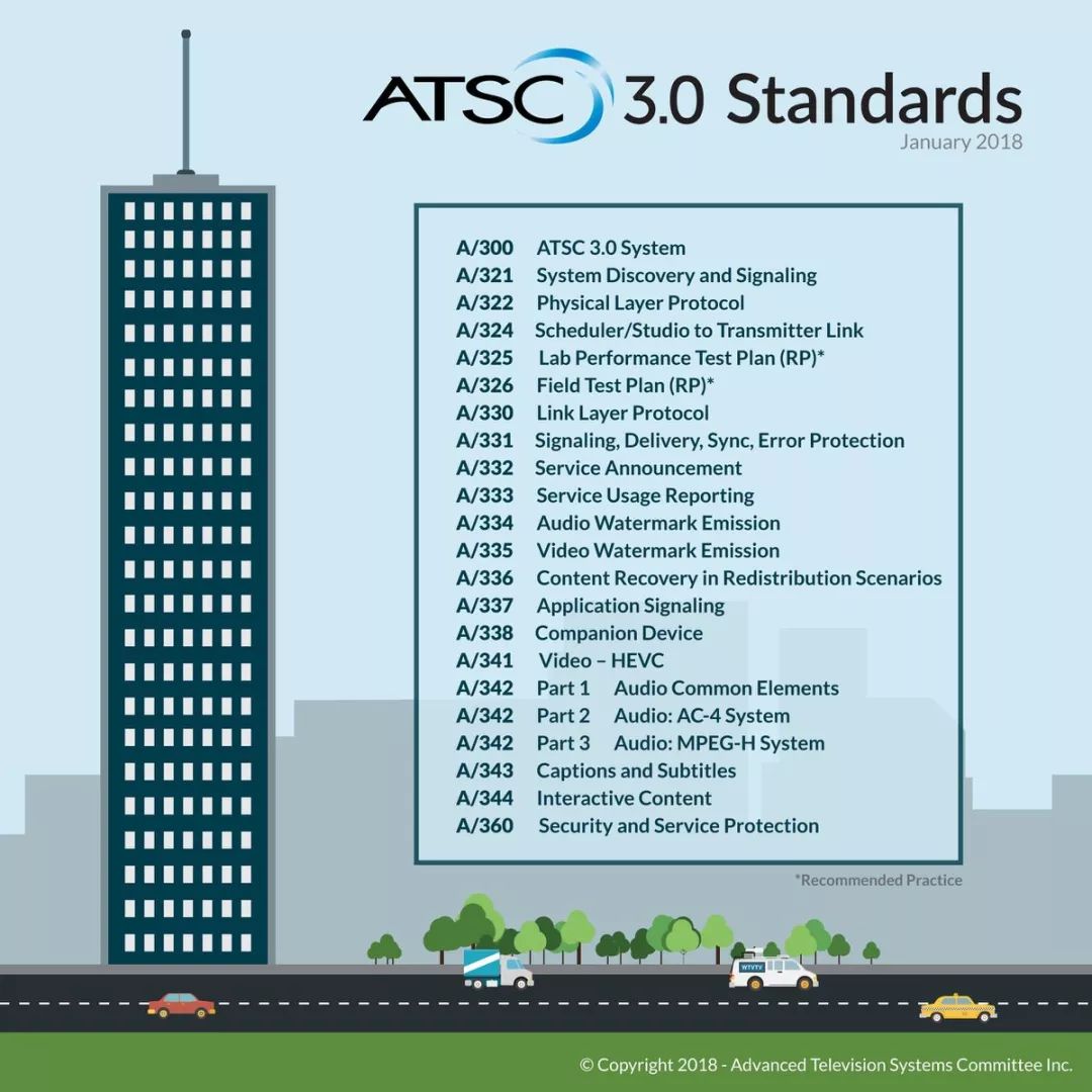 ATSC主席Mark Richer表示:“ATSC 3.0的整套标准将为新的电视服务铺平道路,这是一套比以往标准更灵活、更具适应性的标准。ATSC 3.0将为广播商和观众带来历史性的创新,从稳定的传输到沉浸式音频,从4K超高清电视到互动服务等等。ATSC 3.0包含20个独立标准,能让广播商使用新的传输方式,将无线和宽带服务的革新结合到一起。”